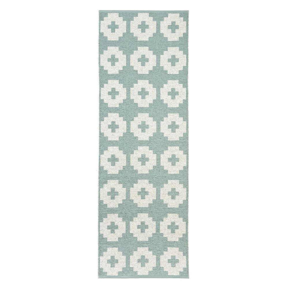 Kaunis Flower-muovimatto värissä Lagoon tulee Brita Swedeniltä. Ruotsissa valmistetussa matossa on nykyaikainen valkoinen kuvio turkoosinsinisellä pohjalla. Valittavanasi on eri kokoja. Muovimatto on käytännöllinen valinta keittiöön tai eteiseen, joissa matolta vaaditaan kestävyyttä ja helppohoitoisuutta.
