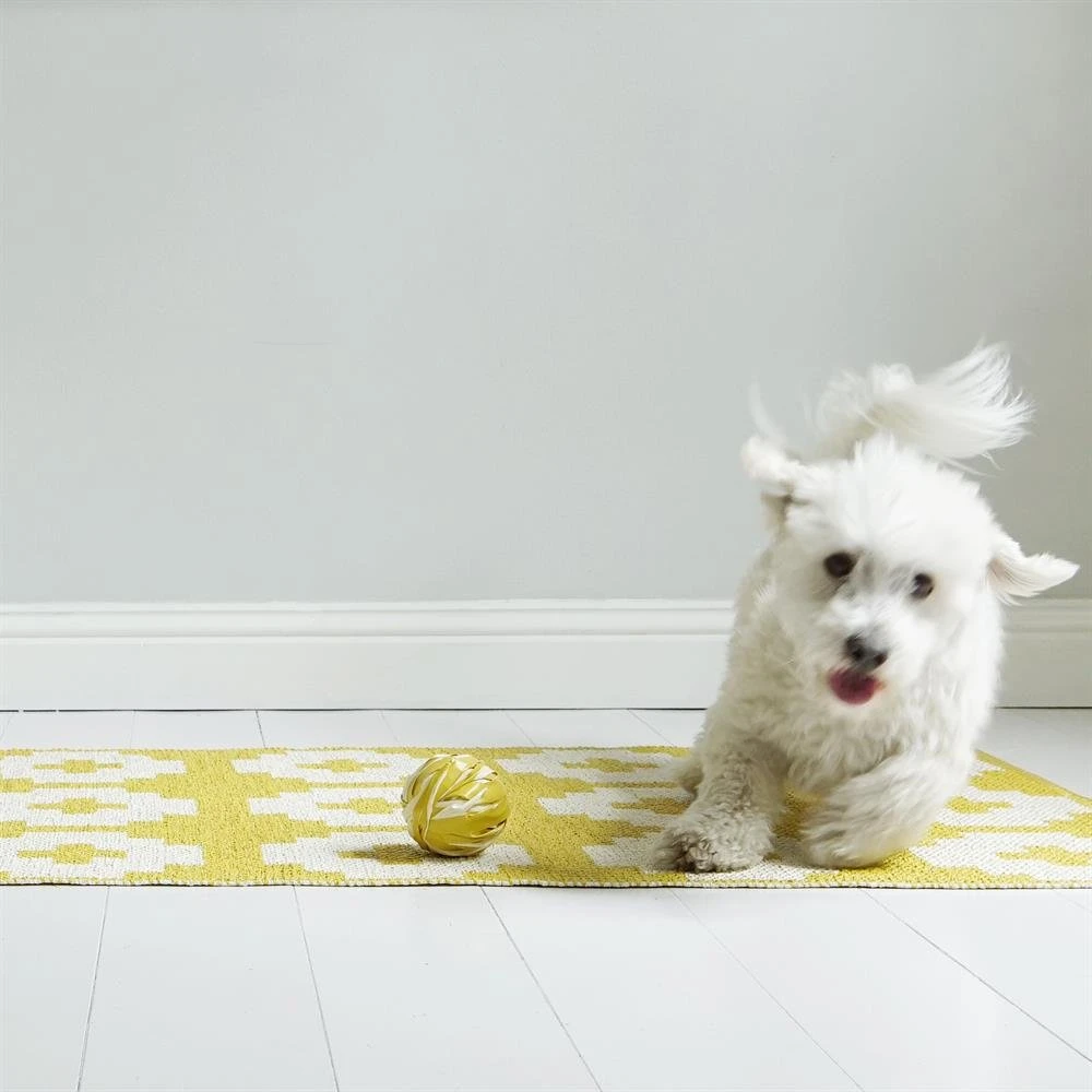 Brita Swedenin aurinkoisen keltainen Flower matto on pehmeää muovia. Se on kudottu perinteisellä tekniikalla ja sitä koristaa kaunis valkoisen ja keltaisen muodostama kuvio. Matto on käännettävä, ja toisella puolella sama kuvio on vastakkaisissa väreissä. Eri kokoja.